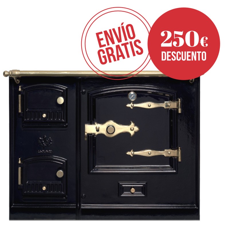 Se trata de un modelo de cocina de obra (suministro de frente y encimera), con puertas ciegas de hierro fundido, herrajes de latón y horno de acero inoxidable con escotilla de limpieza.