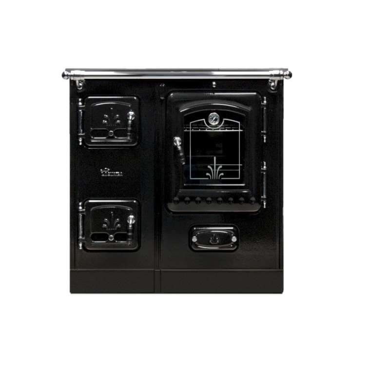 Cocina de leña cerrada Lacunza Lis 5T SV Vitrocerámica está fabricada en hierro fundido con puerta de horno con cristal. Herrajes cromados (plateados) y horno de acero inoxidable con escotilla de limpieza. Sistema de doble combustión de serie. Potencia máxima: 11,5kW