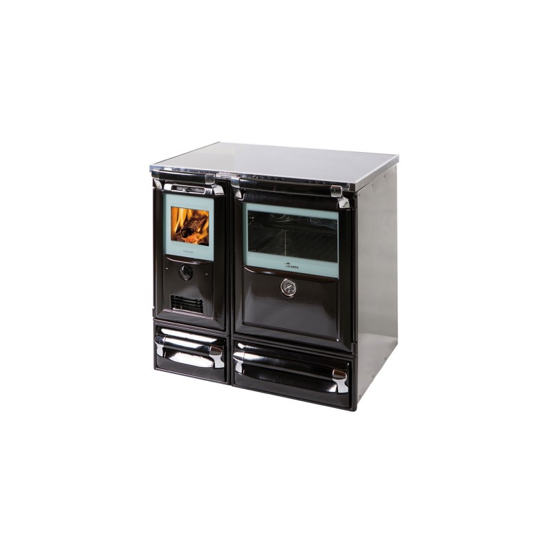 Cocina cerrada (modular) fabricada en hierro fundido. Doble cristal en la puerta de hogar y control de tiro termostático. Herrajes cromados y horno de acero inoxidable co escotilla de limpieza y extracción de vahos de serie. Patas elevables.