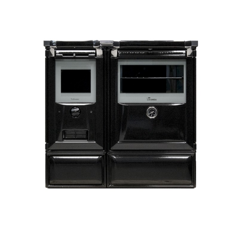 Cocina de leña Lacunza Modelo Vulcano 7T Vitrocerámica, estufa de leña fabricada en hierro fundido, con doble cristal en la puerta del hogar y control de tiro termóstatico. Encimera vitrocerámica elevable con plancha inferior de hierro fundido. Cuenta con sistema de doble combustión. Potencia máx 13 kw