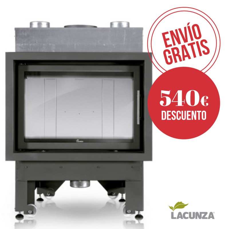 Monobloque Lacunza Inca 80 T CV forjada en acero, hogar en thermotte y base hogar de fundición con cenicero. Sistema de doble combustión y toma de aire exterior (120 mm) canalizable. Consta de 4 salidas superiores para aire caliente e incluye un marco de serie de 25mm. Versión con turbina 800 m3/h