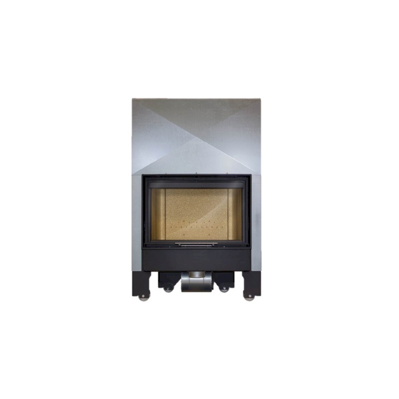 Monobloque Lacunza Itaca 80 ECO V forjada en acero, puerta guillotina, con hogar en vermiculita y base de hogar en fundición con cenicero. Sistema de doble combustión y toma de aire exterior (120 mm) canalizable. Consta de 4 salidas superiores para aire caliente