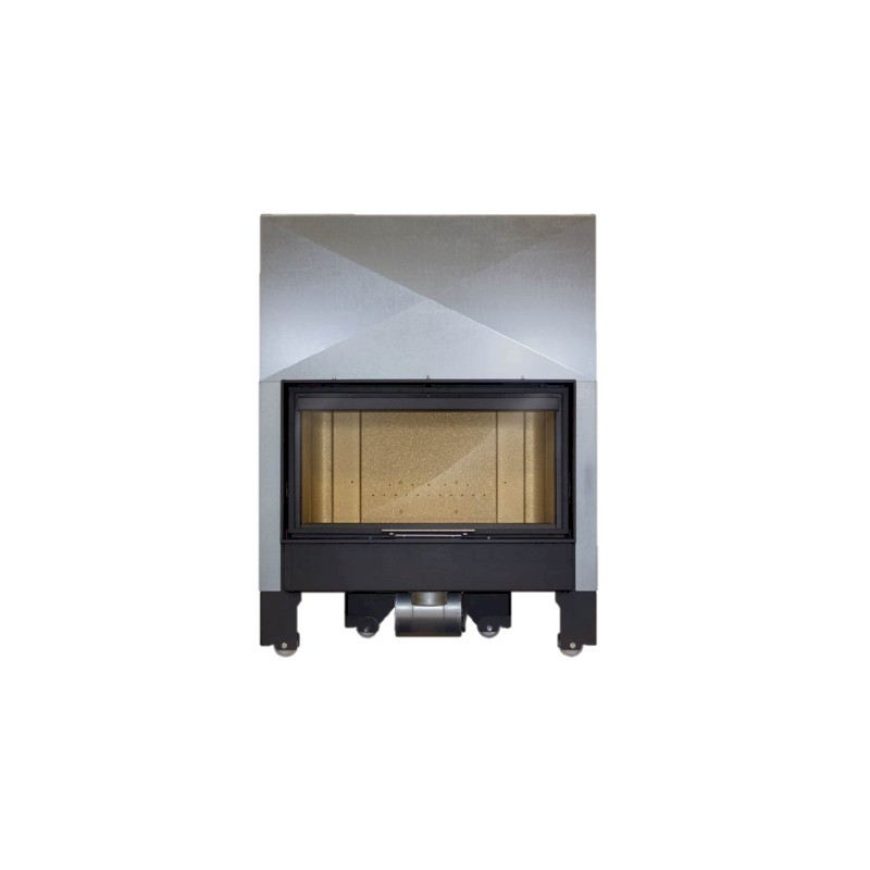 Monobloque Lacunza Itaca 100 ECO V CV forjada en acero, puerta guillotina, con hogar en vermiculita y base de hogar en fundición con cenicero. Sistema de doble combustión y toma de aire exterior (120 mm) canalizable. Consta de 4 salidas superiores para aire caliente. Versión con turbina 800 m3/h