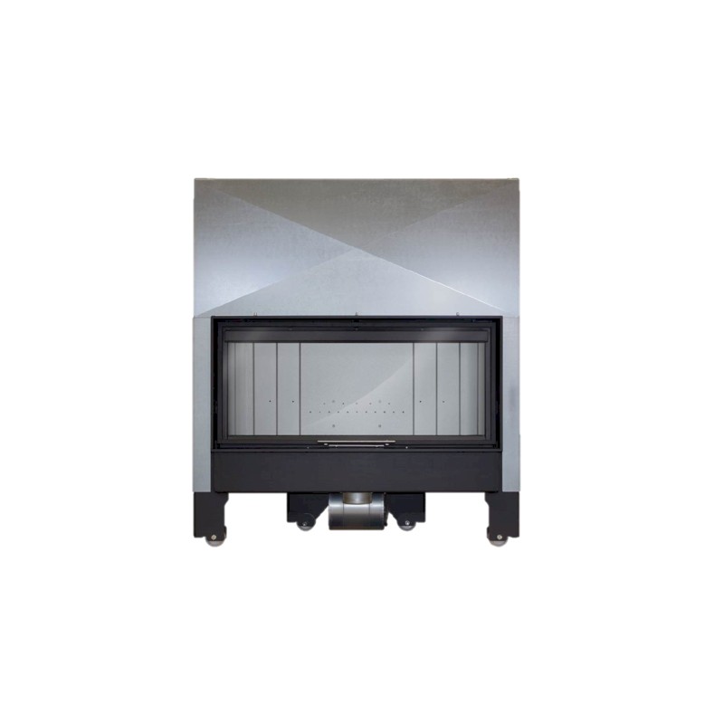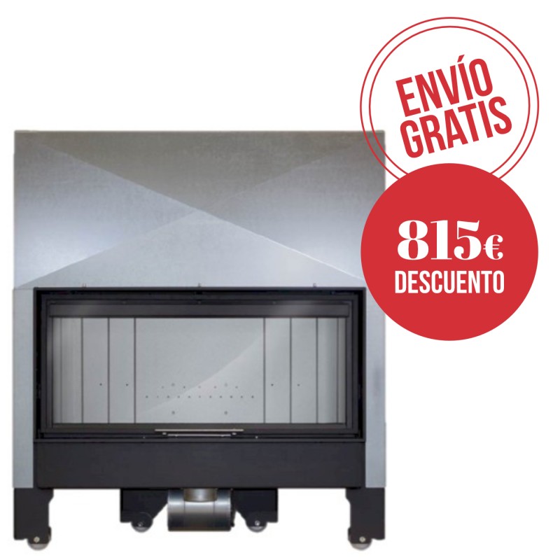 Monobloque Lacunza Itaca 120 ECO T forjada en acero, puerta guillotina, con hogar en thermotte y base de hogar en fundición con cenicero. Sistema de doble combustión y toma de aire exterior (120 mm) canalizable. Consta de 4 salidas superiores para aire caliente
