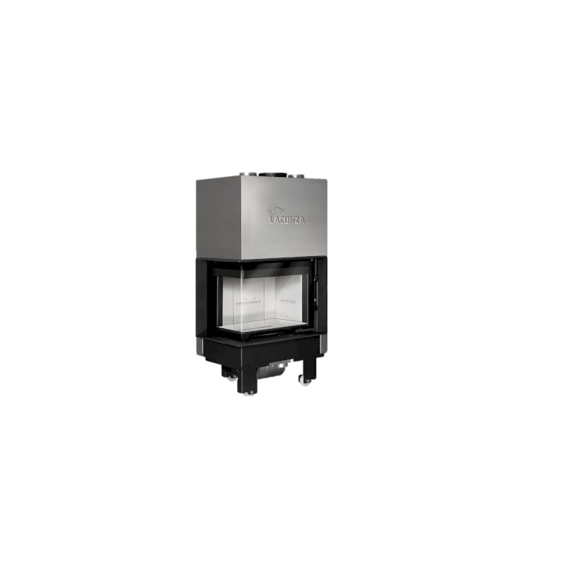 Monobloque Lacunza Izaro 60 CLI Blanco forjada en acero, puerta guillotina a dos caras con cristal en una sola pieza de ángulo curvo (lateral izquierdo) y hogar en vermiculita blanca. Sistema de doble combustión, toma de aire exterior (120 mm) canalizable y 2 salidas superiores para aire caliente.