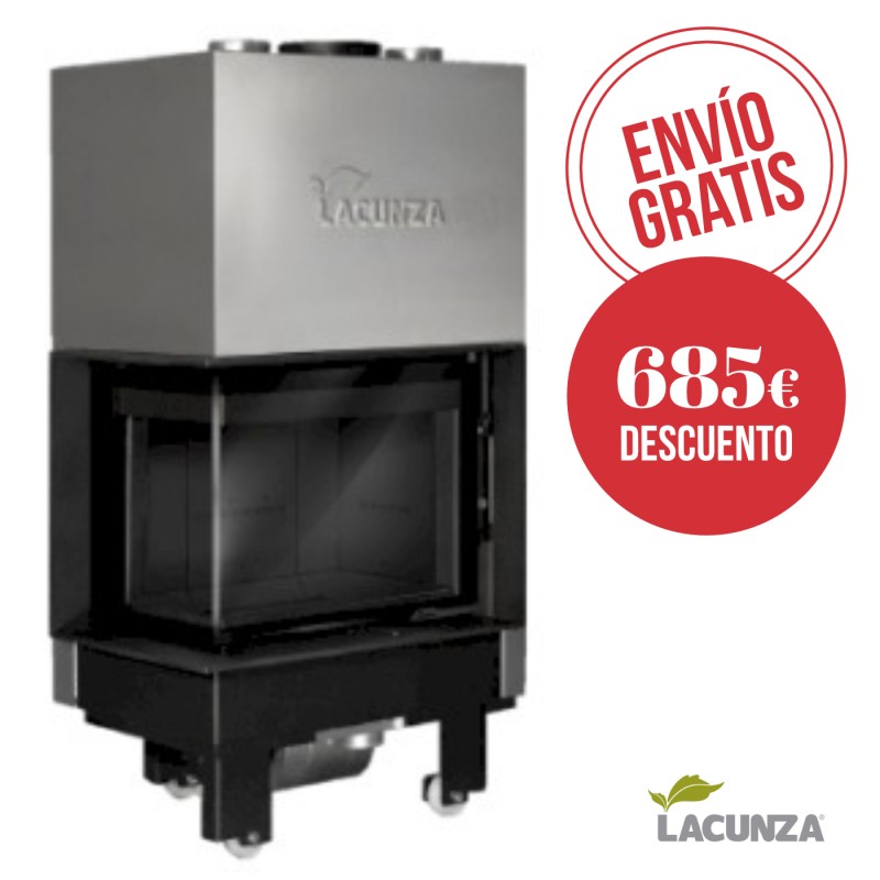 Monobloque Lacunza Izaro 60 CLI Negro forjada en acero, puerta guillotina a dos caras con cristal en una sola pieza de ángulo curvo (lateral izquierdo) y hogar en vermiculita negra. Sistema de doble combustión, toma de aire exterior (120 mm) canalizable y 2 salidas superiores para aire caliente.