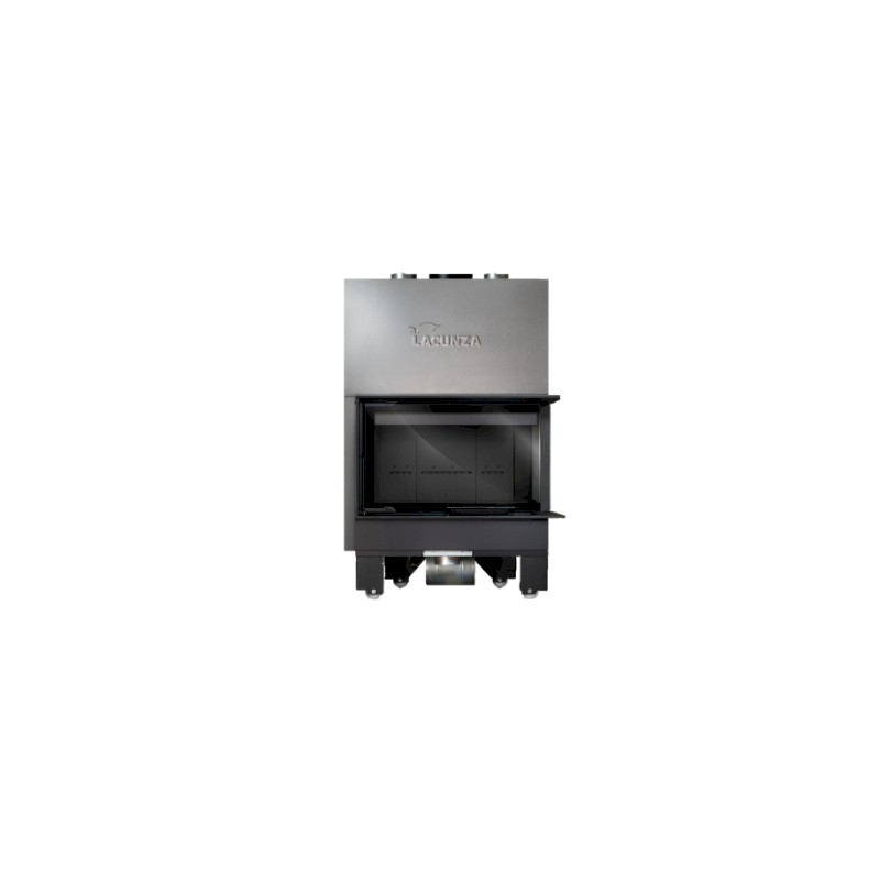 Monobloque Lacunza Izaro 80 CLD Negro forjada en acero, puerta guillotina a dos caras con cristal en una sola pieza de ángulo curvo (lateral derecho) y hogar en vermiculita negra. Sistema de doble combustión, toma de aire exterior (120 mm) canalizable y 2 salidas superiores para aire caliente.