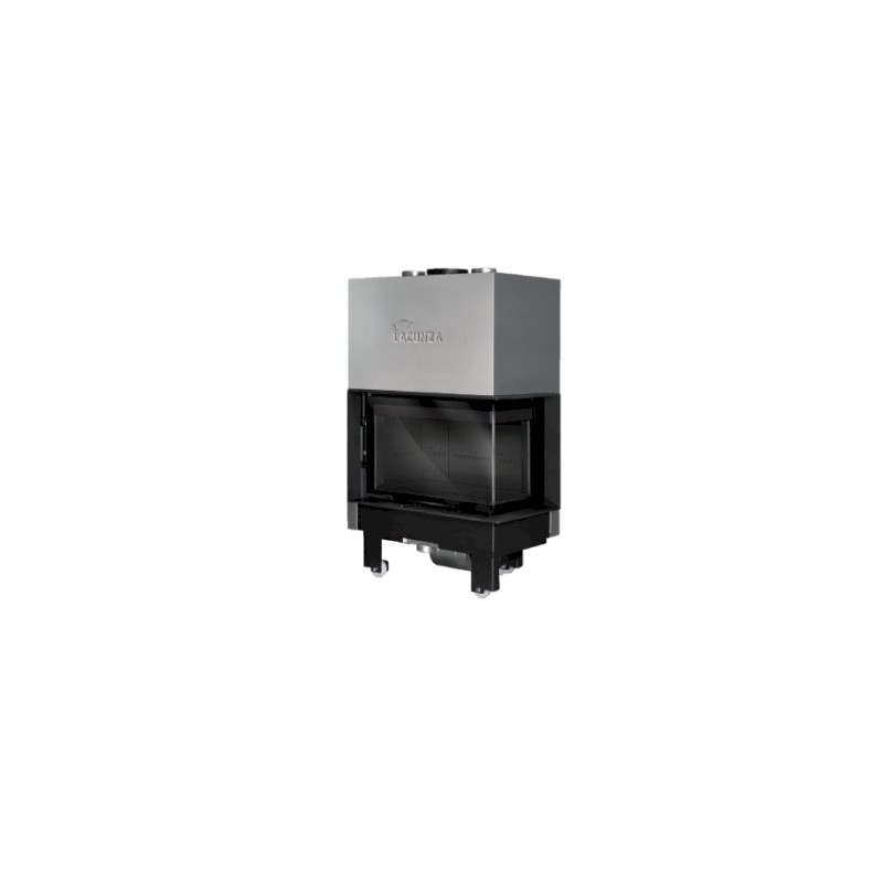 Forjada en acero, puerta guillotina a dos caras con cristal en una sola pieza de ángulo curvo (lateral derecho) y hogar en vermiculita negro. Sistema de doble combustión, toma de aire exterior (120 mm) canalizable y 2 salidas superiores para aire caliente. Versión con turbina 800 m3/h más potenciómetro.