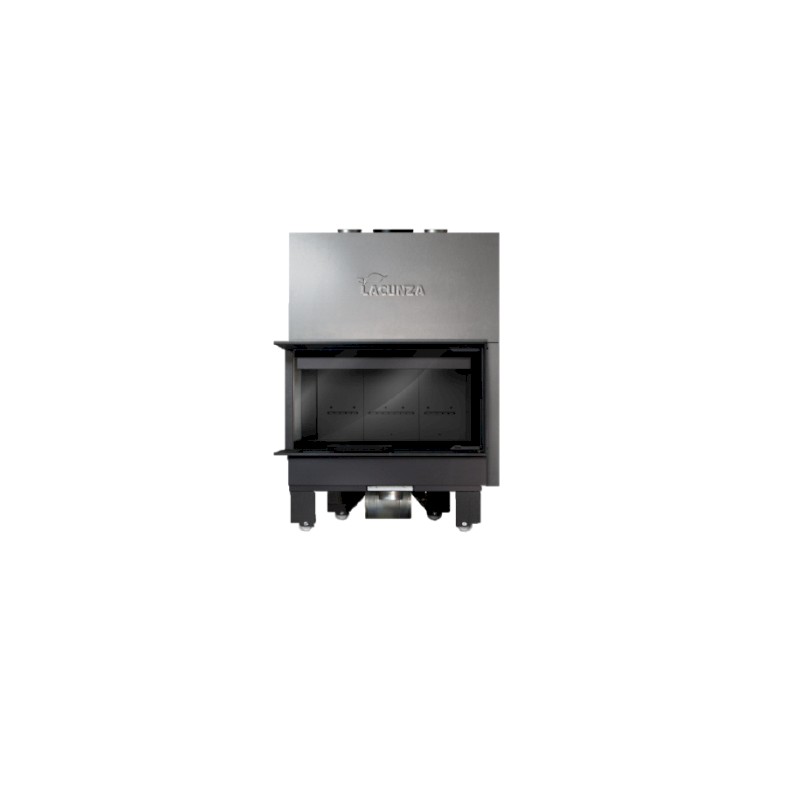 Monobloque Lacunza Izaro 100 CLI Negro forjada en acero, puerta guillotina a dos caras con cristal en una sola pieza de ángulo curvo (lateral izquierdo) y hogar en vermiculita negra. Sistema de doble combustión, toma de aire exterior (120 mm) canalizable y 2 salidas superiores para aire caliente.