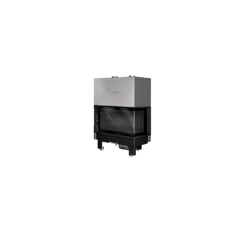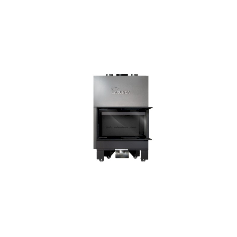Forjada en acero, puerta guillotina a dos caras con cristal en una sola pieza de ángulo curvo (lateral derecho) y hogar en vermiculita negro. Sistema de doble combustión, toma de aire exterior (120 mm) canalizable y 2 salidas superiores para aire caliente. Versión con turbina 800 m3/h más potenciómetro.