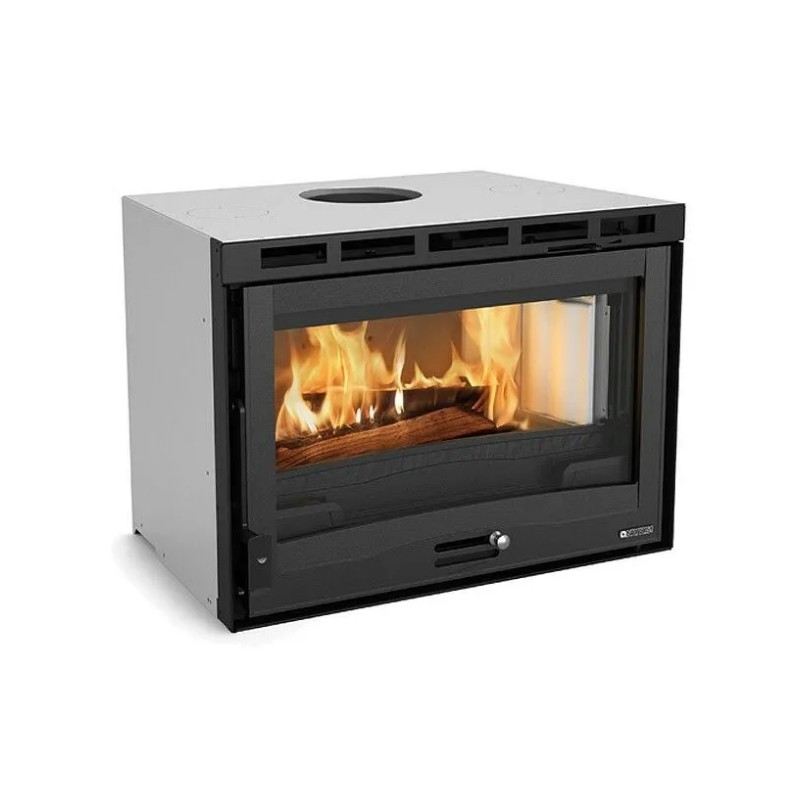 El insertable de leña Nórdica 70 Cristal cuenta con una estructura de hierro fundido y puerta de fundición. Incluye un cajón de ceniza extraíble y dos ventiladores tangenciales de serie.