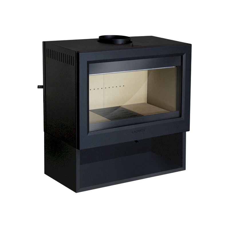 La estufa de leña Lacunza Lugo está forjada en fundición y acero con interior en vermiculita. Contiene una parrilla de fundición, base de refractario y un cajón leñero inferior.