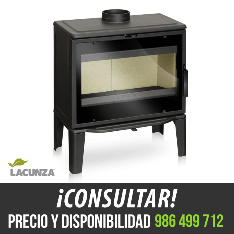 Estufa de leña Lacunza Biarritz, con un sistema de doble combustión, cuenta con una puerta con cristal serigrafiado y el interior en vermiculita.