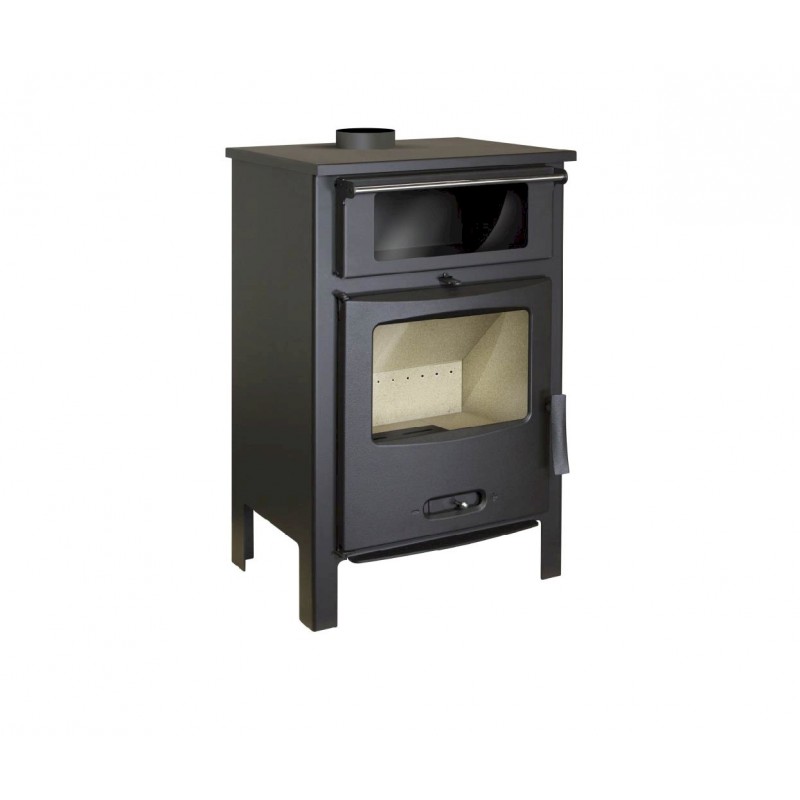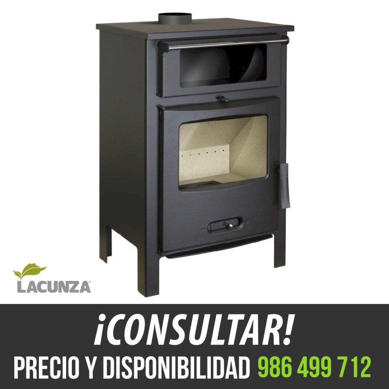 Estufa de leña Lacunza Sagra CH de acero con puerta de fundición, interior en vermiculita y sistema de doble combustión con control independiente. Contiene una parrilla de leña de fundición.