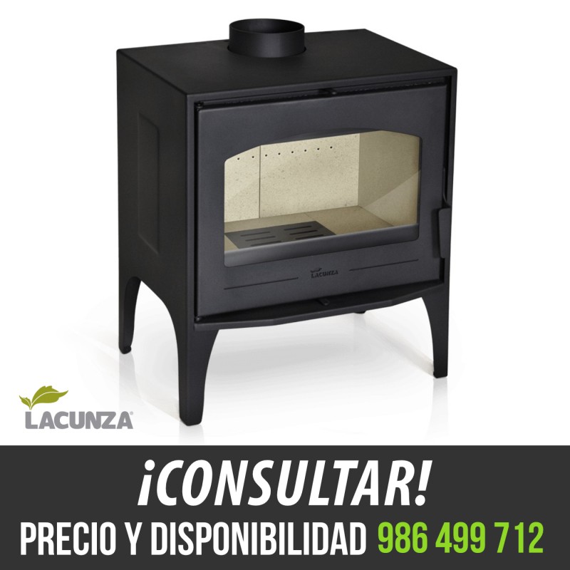 Estufa de leña Lacunza Calpe, es una estufa de acero con interior en vermiculita y sistema de doble combustión. Contiene una parrilla de fundición.