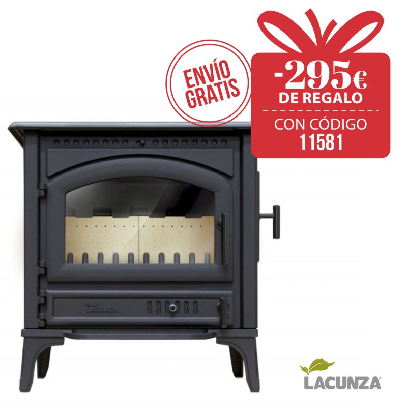 La estufa de leña Lacunza Levante está creada en fundición con un interior en vermiculita y una segunda puerta lateral (para troncos más largos). Consta de un sistema doble de combustión y un sistema de cristal limpio.