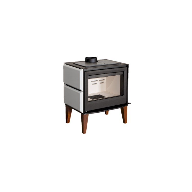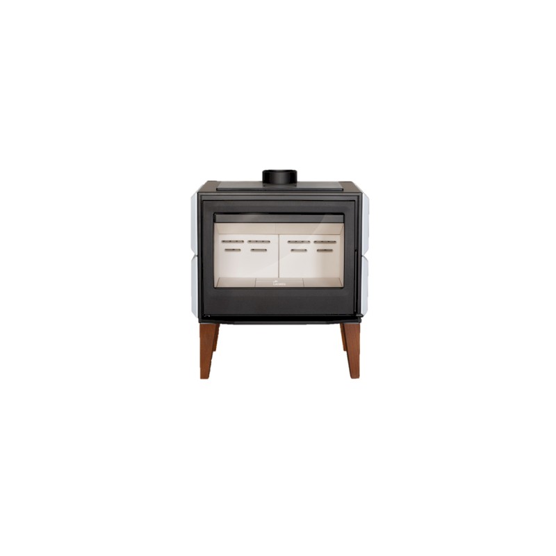 La estufa de leña Lacunza Maule está fabricada en acero con puerta de fundición y patas de madera de iroko. Hogar de Thermiker cerámico blanco, más duro y con mayor inercia térmica. Consta de unos laterales con efecto de convección optimizado para una rápida liberación del calor