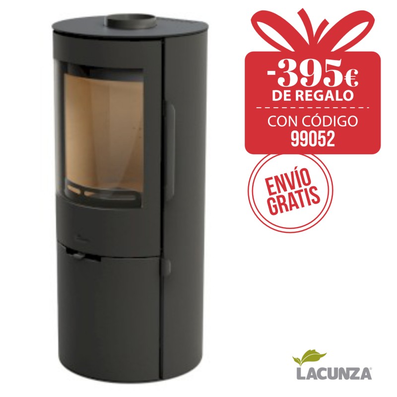 La estufa de leña Lacunza Maya es un novedoso modelo con diseño vertical y forma circular creada en acero con puerta de fundición o cristal serigrafiado con interior en vermiculita, leñero con puerta, parrilla de fundición y cajón de cenizas extraíble. Consta de un sistema de doble combustión.