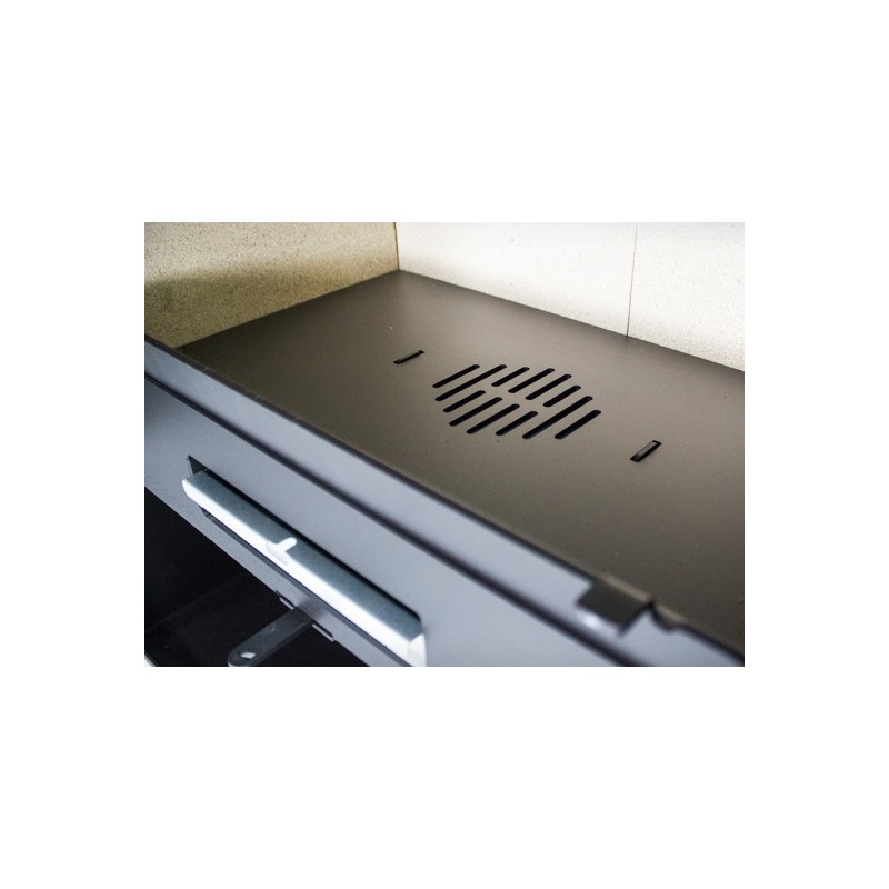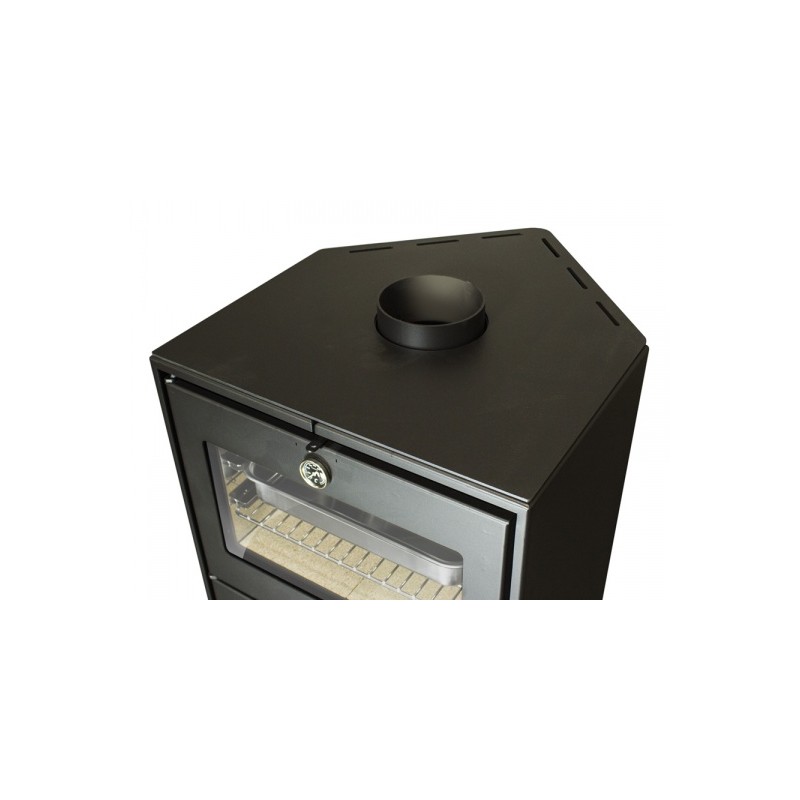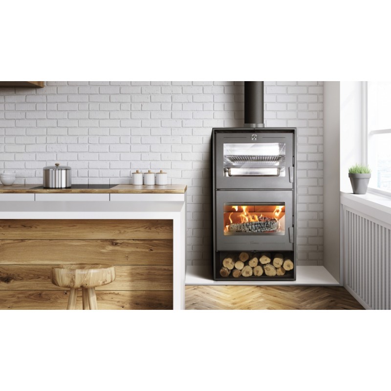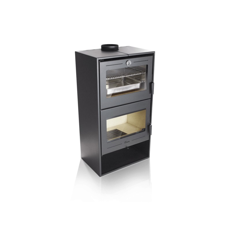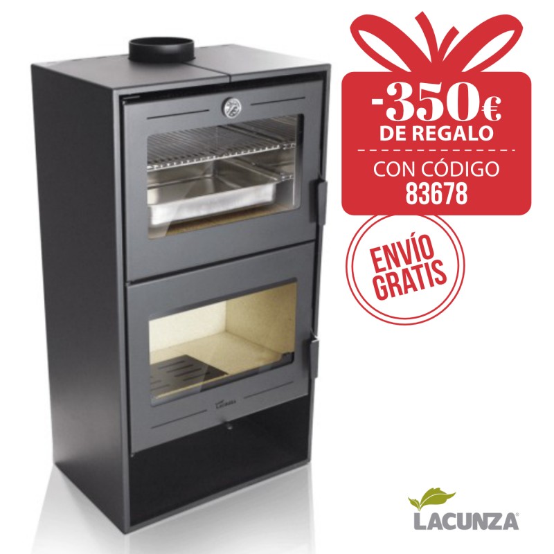 Estufa de leña Lacunza Oslo con Horno: Fabricada en acero de alta resistencia, la Oslo combina una potente calefacción con un práctico horno superior de acero inoxidable. Incluye parrilla de asados, sistema de extracción de vapores de horno y un diseño moderno ideal para cualquier salón.
