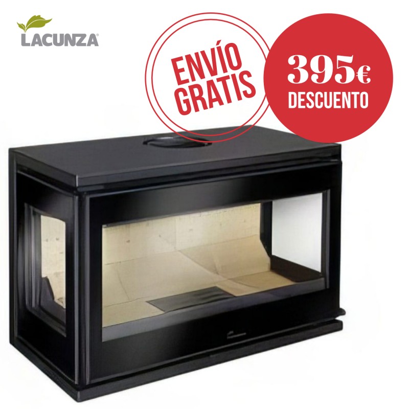 La estufa de leña Lacunza Paris 700 Clid Mural ST (Sin turbina) está forjada en acero y consta de tres caras para una visión del fuego total desde distintos ángulos. Sistema de doble combustión y cristal limpio.