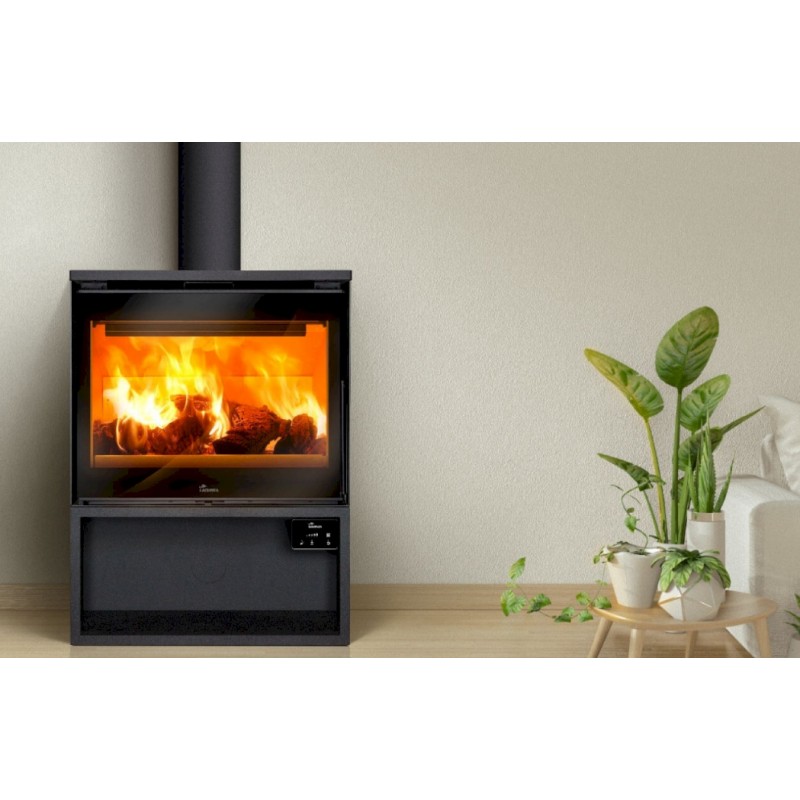 La estufa de leña Lacunza Roma 700 está forjada en acero con el interior en vermiculita. Consta de 2 turbinas centrífugas de 125m3/h desconectables, sistema de doble combustión, potenciómetro con mando a distancia (5 velocidades y On/Off) y una gran visión del fuego.