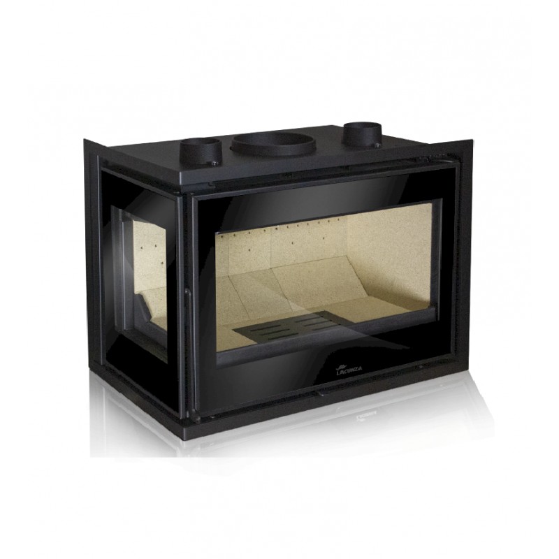 Lacunza Adour 700 CLI es una chimenea insertable de acero con interior de vermiculita y cristal en el lateral izquierdo. Cuenta con una turbina centrífuga de 125m3/h desconectable, potenciómetro con mando a distancia (5 velocidades y On/Off) y un sistema de doble combustión.