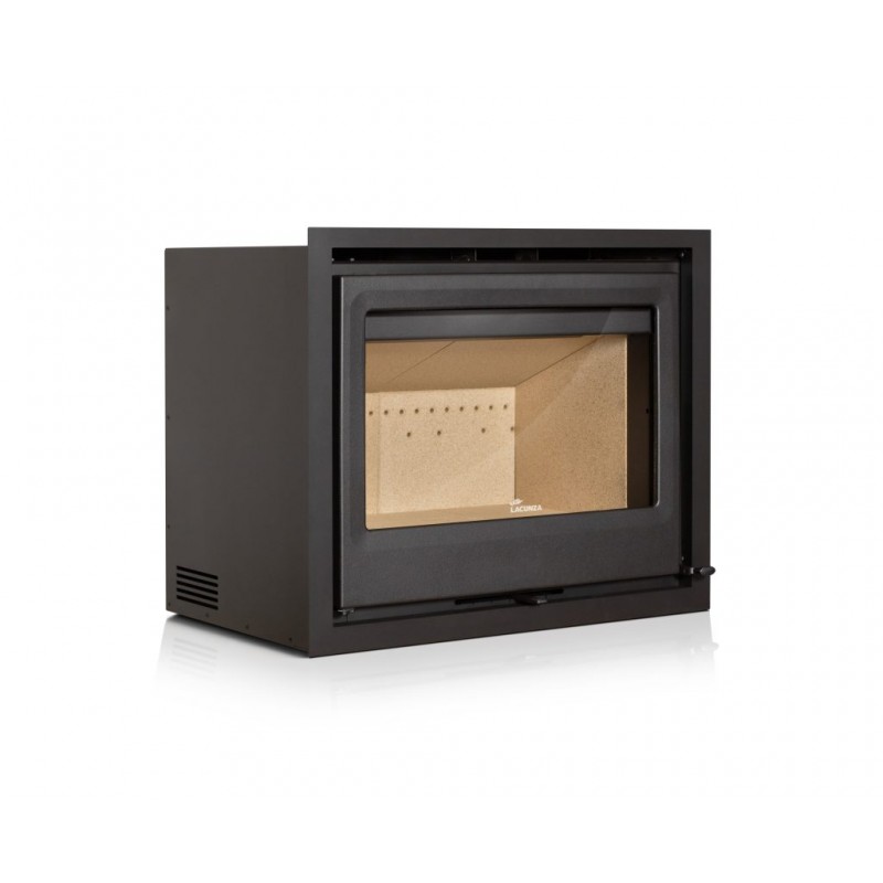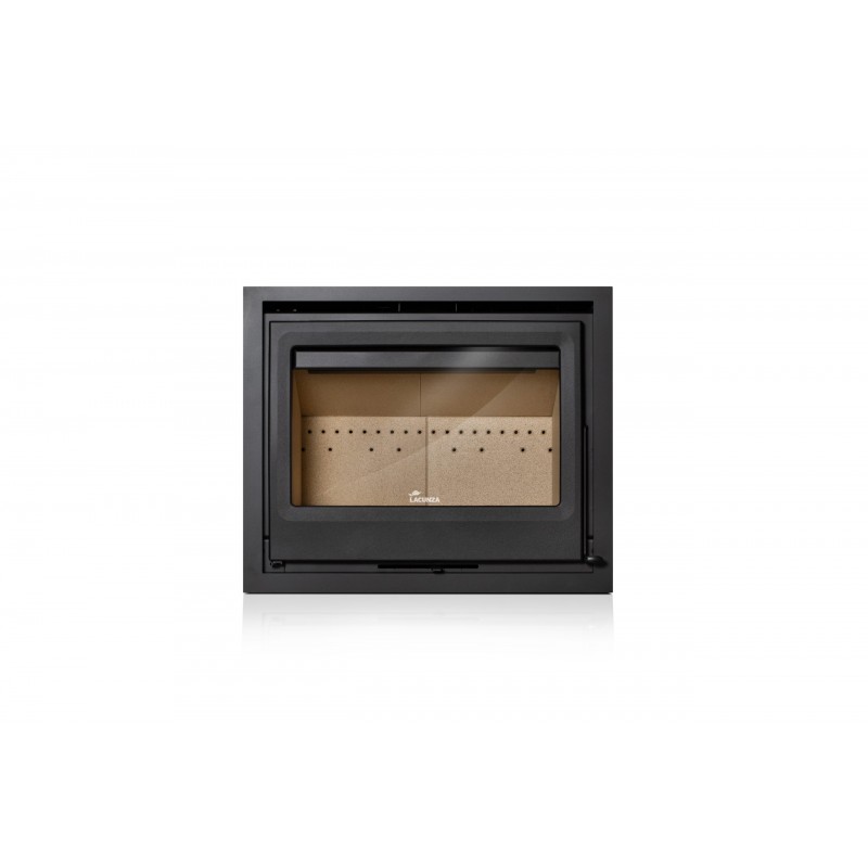 Lacunza Laga es una chimenea insertable de acero con puerta de fundición e interior en vermiculita. Cuenta con dos turbinas centrífugas de 125m3/h, potenciómetro (5 velocidades + On/Off) con mando a distancia y un sistema de doble combustión
