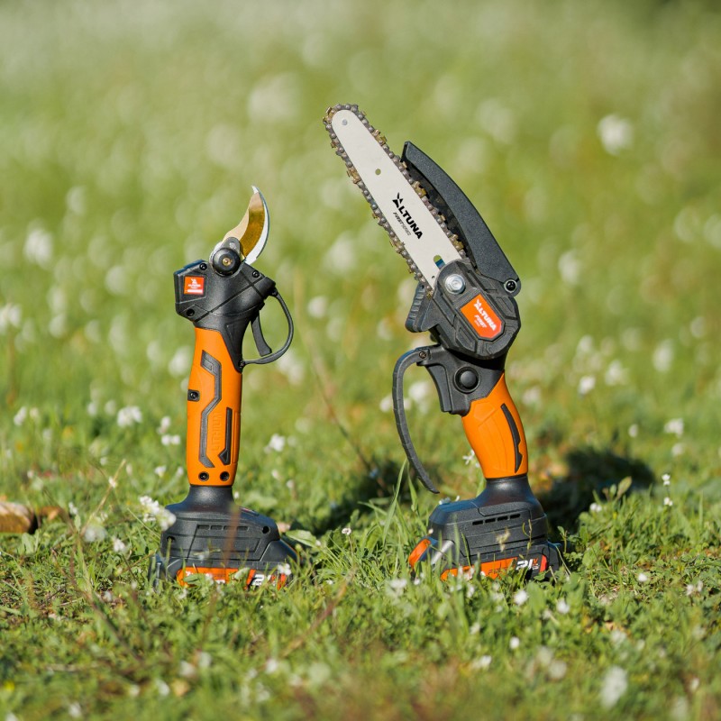 Kit a Batería AFKIT Altuna Tijera + Motosierra + Pértiga + 2 Baterías, El kit de poda incluye tijera AF28 con una capacidad de corte de hasta 28 mm, motosierra AF150 espada de 150 mm, cuchilla y cadena de titanio, pértiga extensible AFPER de 103 a 163 cm, y 2 Baterías de 21V – 2.0 Ah. Ideal para iniciarse con la poda a batería en jardines y frutales. Gama FIRST de ALTUNA.